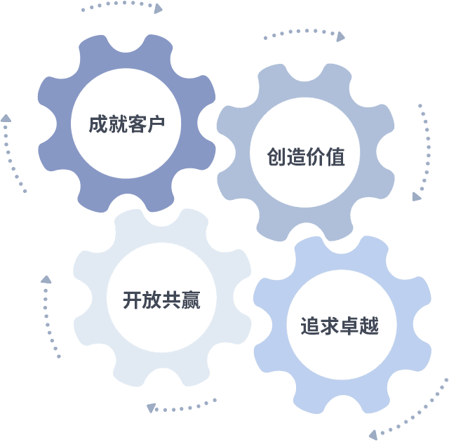 成就客户是一切决策的出发点,,,创造价值是衡量所有工作的标准,,,追求卓越是我们做事做人的态度,,,,开放共赢是我们的格局也是最终的结果。。价值观的齿轮环环相扣,,,,推动着组织里的每个人不断向前。。